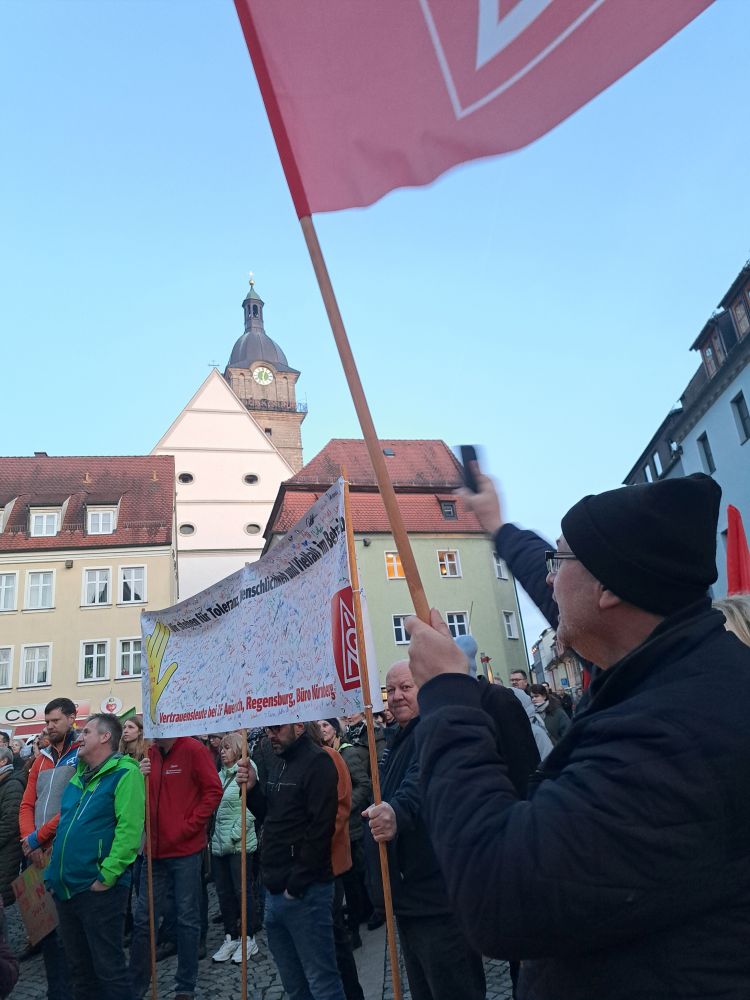 Unsere zweite Bevollmächtigte der IG Metall Amberg, Sabrina Feige erinnerte noch einmal an das Geheimtreffen in Potsdam, wo über die Deportation von Menschen gesprochen wurde. „Das hätte man sich vor einiger Zeit gar nicht denken können, dass so ein Plan geschmiedet wird und auch noch von so vielen Leuten gestützt wird", sagte sie dazu.